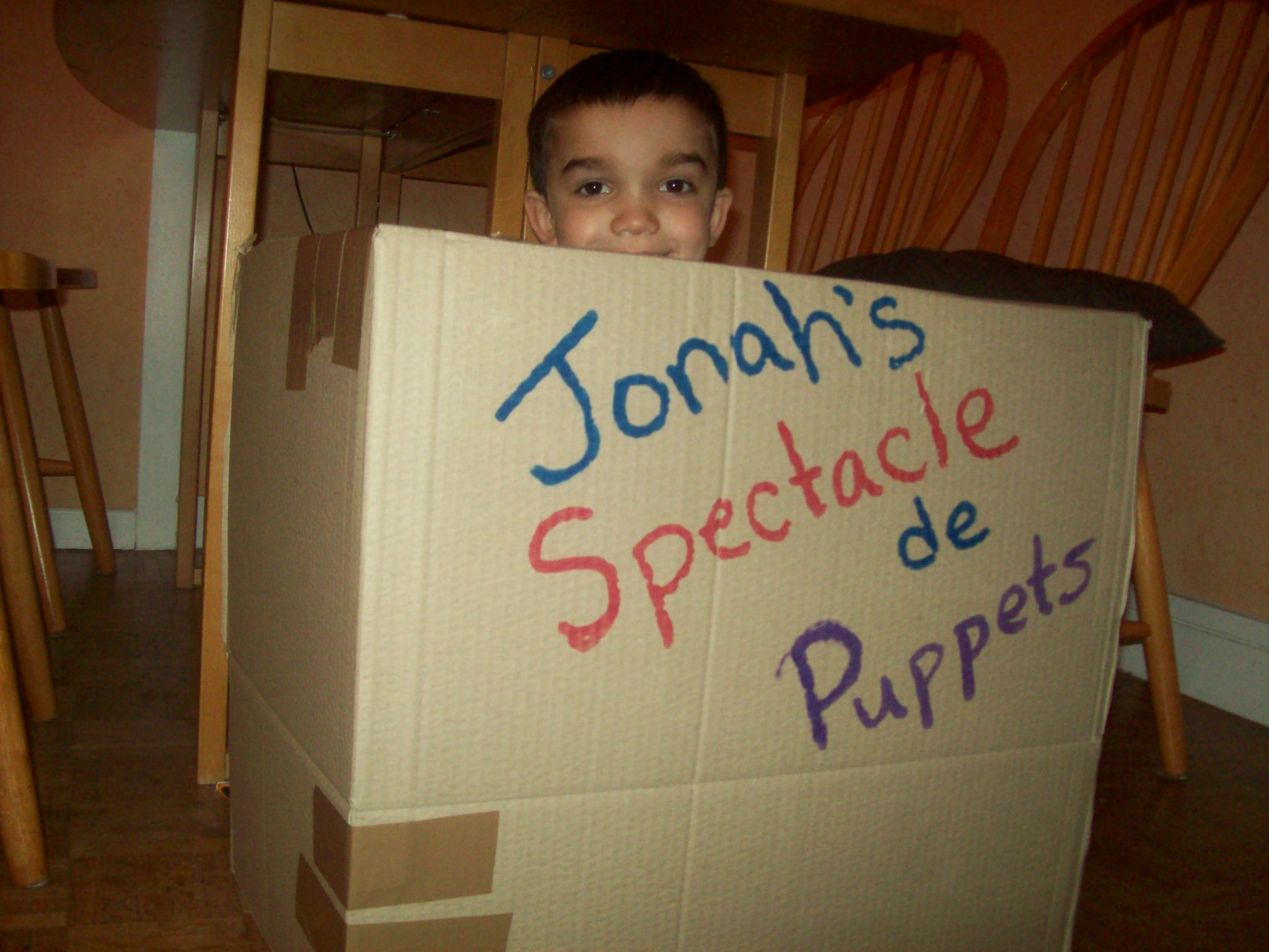 His brother was occupied with something else until he realized how much fun his brother was having being silly and making up monster stories. But the stage said Jonah’s Spectacle de Puppets which meant, at least to Jonah, that his brother could not play behind the stage. I suggested to Jonah that he hire his brother to work for him and he could share his monster puppets. Without blinking Jonah said OK to me and then he said to Joshua, “You can sell popcorn for my puppet show.”