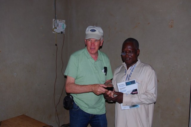 Rick was with Wycliffe Associates and he came to help setup the batteries in Ombessa. Leo had asked for additional lighting so Rick gave him the flashlight that he had and told Leo that he would get additional lighting when he got back to the states that would run off the limited solar power that he has.
