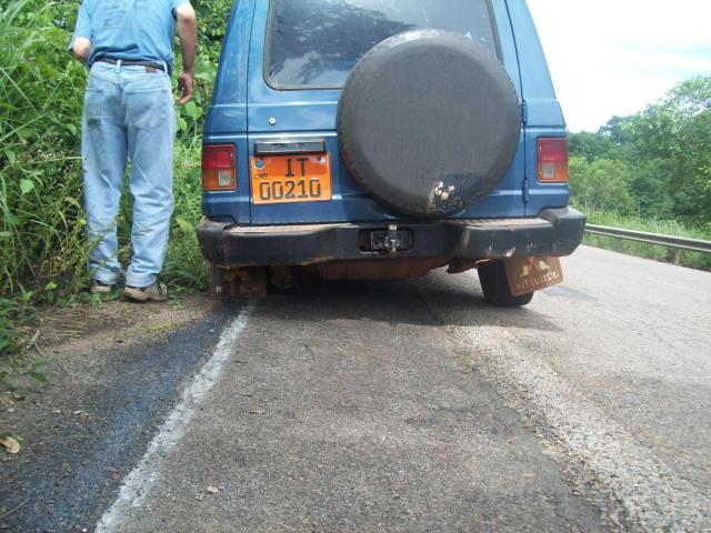 As he installed the axle and tire back on the car and disabled the rear drivers brake so it wouldn’t leak any more fluid he was able to fill up our brake fluid, which I had a full container of in the car. He then took the car for a quick test drive up and down the road and told us we would have no problem driving the vehicle back to Yaoundé 160km away but just don’t drive over 80 kmh. So just after 4 hours of losing a critical part to the car we were back on our way.