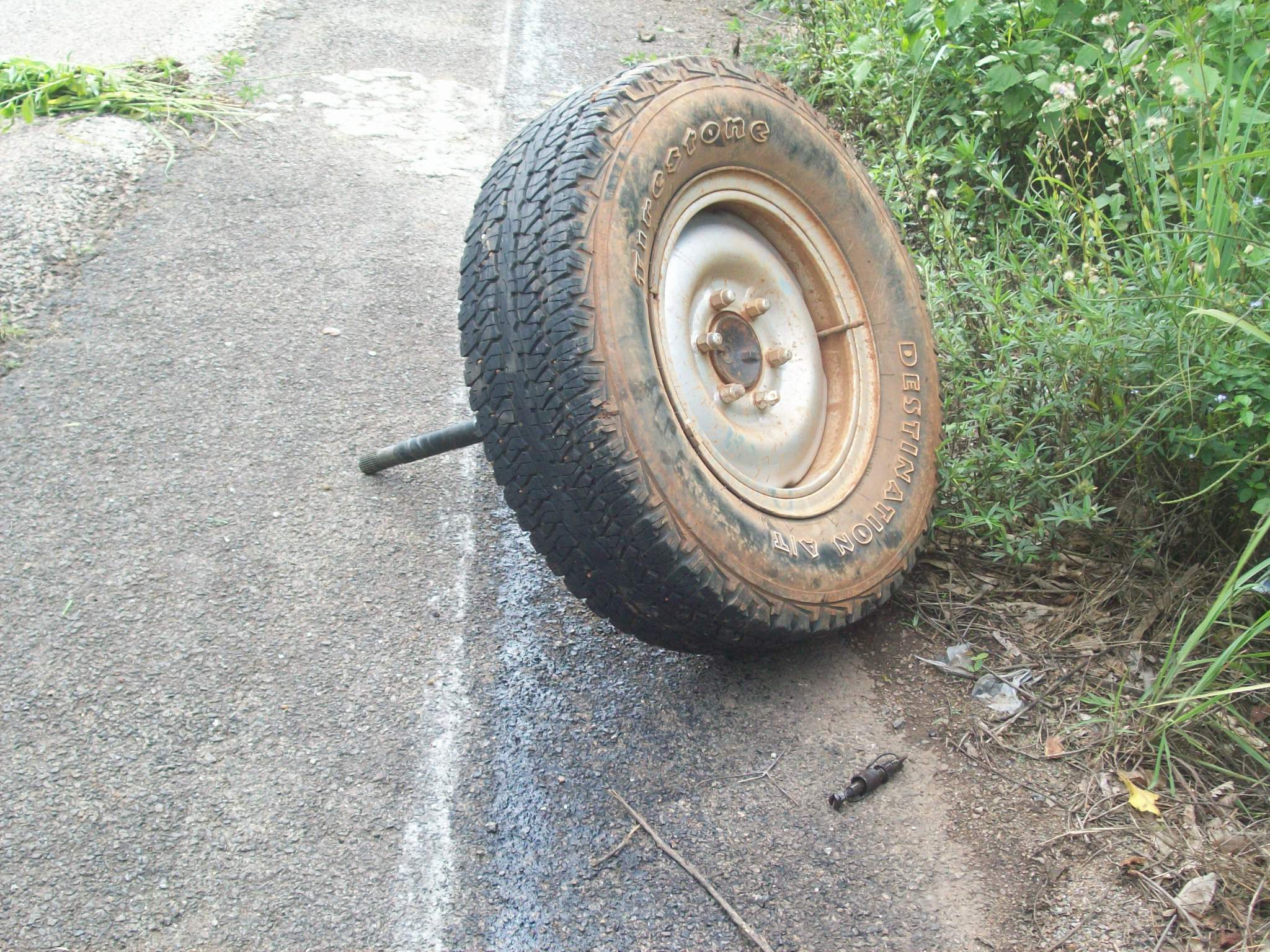 Yesterday we were driving from Kumbo to Yaoundé and just east of Makenene the driver’s side rear axle rod along with the tire and wheel broke away from the car as we were driving at 80 kmh (50 mph) down a hill. Initially I thought we just had a flat tire but seeing a tire rolling down behind me in the side view mirror, I realized it was more than just a flat. I pushed on the breaks and had a difficult time stopping since I only had 3 wheels, but down shifting the car I ended up stopped on the opposite side of the road. Thankfully there were no cars coming, as the car came to a stop on the only side of the road that even had a partial shoulder.