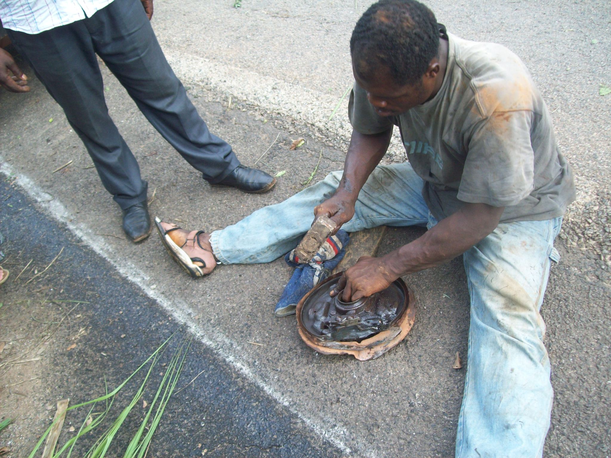 As I got out of the car to assess the damage I quickly noticed that the tire was nowhere to be seen and that it must have went off the road into the densely over grown rain forest. But, before I was able to say, “Where did the tire go?” two Cameroonians that where driving behind me on a motorcycle hopped of the motorcycle and climbed down the ravine to look for the missing axle and wheel. Before they were back a second car stopped and this man was on his way home and he was a mechanic and he asked us if we needed any help.