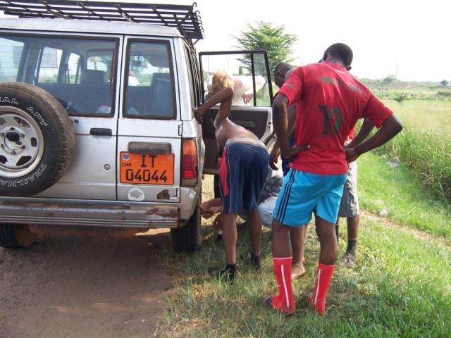 We had pulled over near a soccer game, on the main road in front of the Douala international airport and within a few seconds had an army of helpers to assist us. So we grabbed the tools and tried to loosen the lug nuts, they were not going to move, I even had 2 Cameroonians that jumped up and down on the end of the wrench to try. So I paid someone to go try and find some tools for us. He came back about 5 minutes later with the tools in hand, we got the tire off and the spare put on and when they went to lower the jack somehow the hydraulic center broke and we couldn’t lower the car, so they lifted up the car and I pulled out the jack.