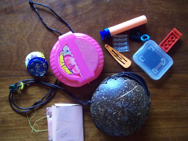 He has definitely become a saver of treasures he finds, his latest was a girls scrunchy for their hair that he wears as a necklace.
