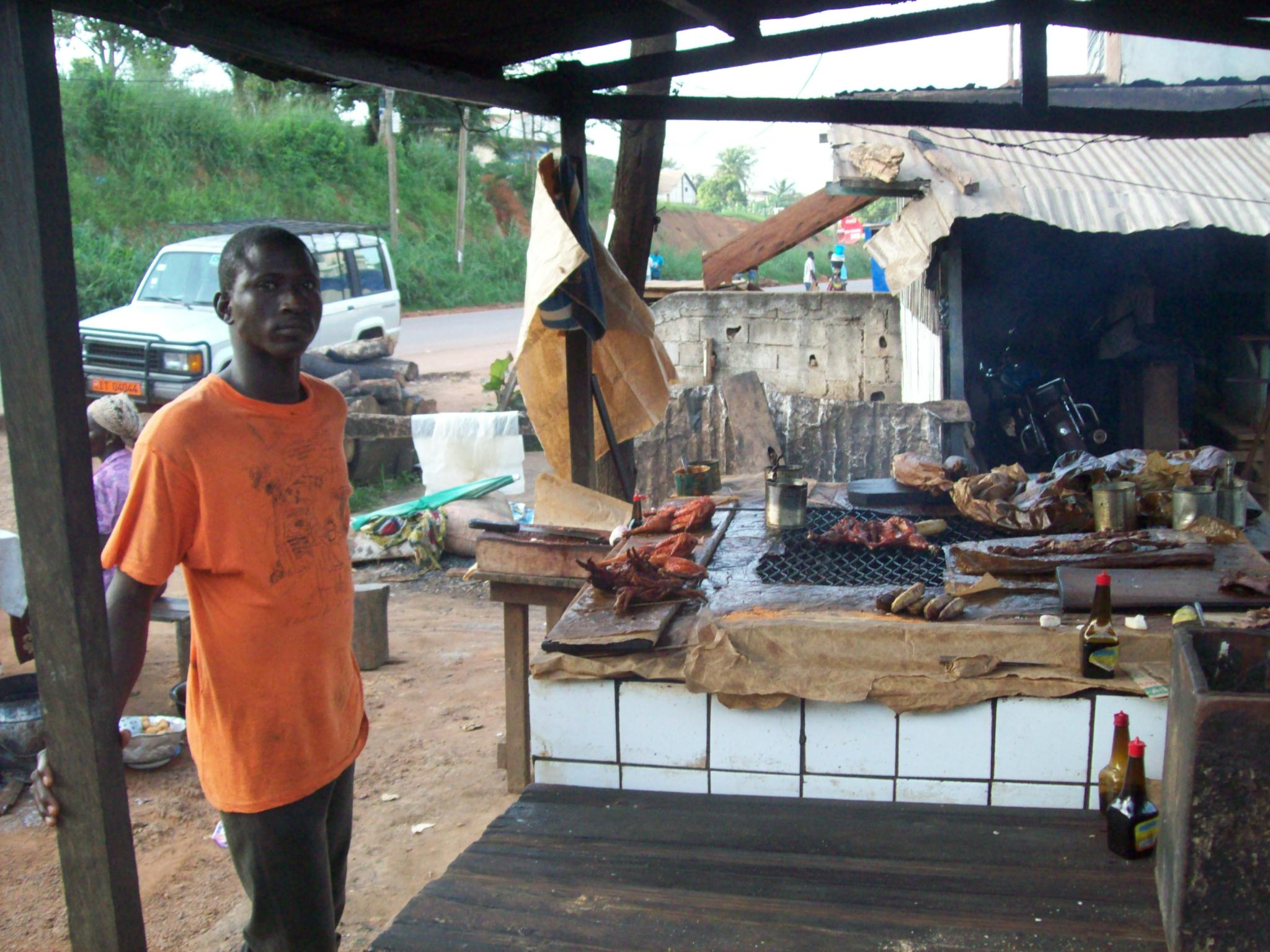 When we lived in Independence, Lee’s Summit and Pleasant Hill, we had a drawer full of take out menus.  We also had magnets from various restaurants on our refrigerator.  We thought it was wonderful when restaurants started curb side to go service.  When we were living in Massy, France we were spoiled with having a take-out gyro restaurant around the corner and McDonald’s & Pizza Hut within walking distance.  Here we have a few options for take out: (1) chicken cooked on the side of the road (2) sliced beef cooked on the side of the road (3) grilled plantains (4) beignet – fried bread balls (5) smoked fish.  We splurged and had the chicken and beef.  This food was prepped and prepared roadside, wrapped in torn sack paper and placed in a plastic bag.  We always reheat the food at home before eating it.