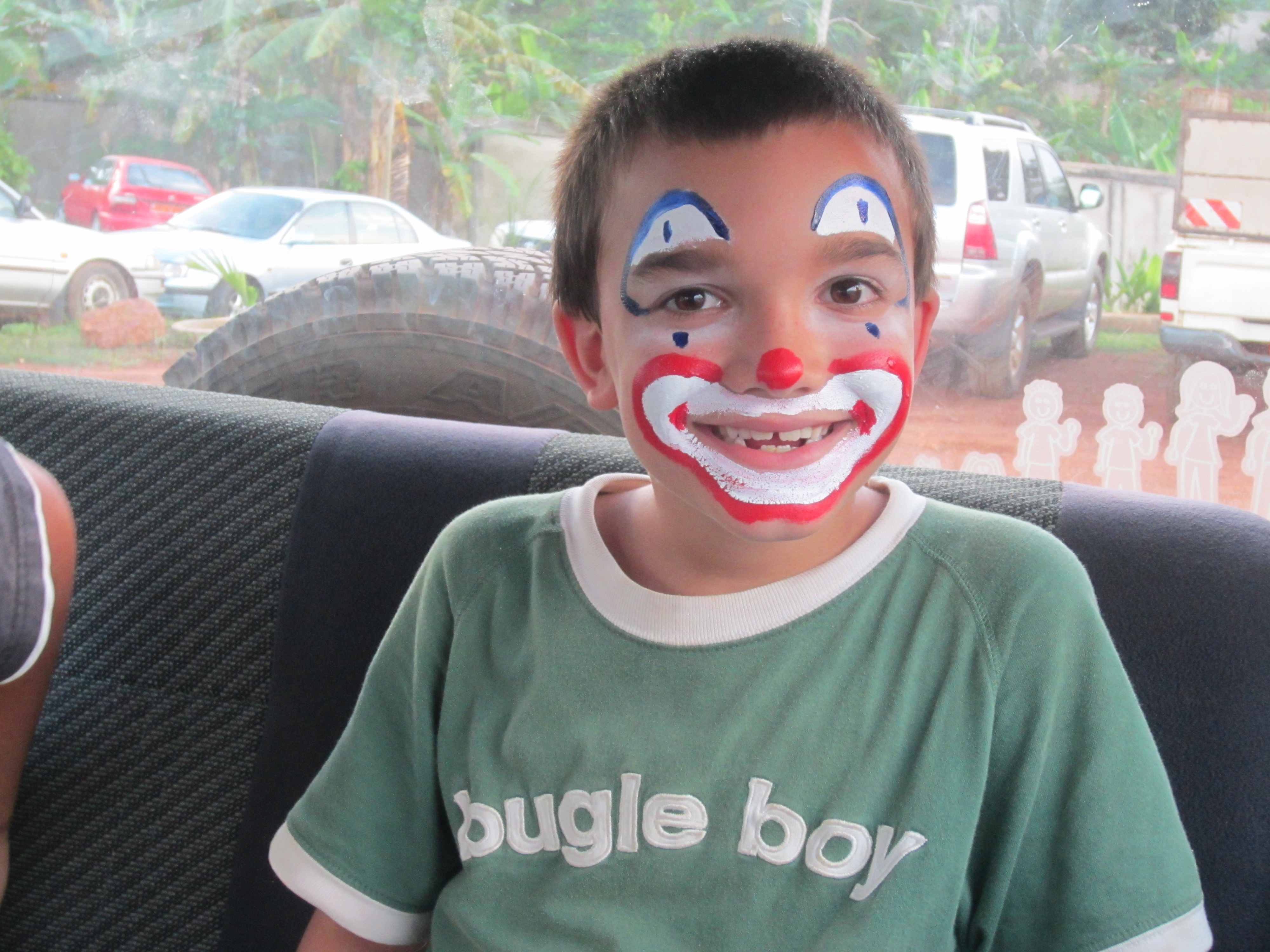 We look forward to the annual RFIS Carnival. The middle/high school puts on a carnival of fun activities from fishing for a prize to bobbing for Tampico’s (juice bags instead of juice boxes) to a small treasure hunt to a cake walk to a ring toss to a zip line and more. There was a face painting booth and Jonah was transformed into a clown.