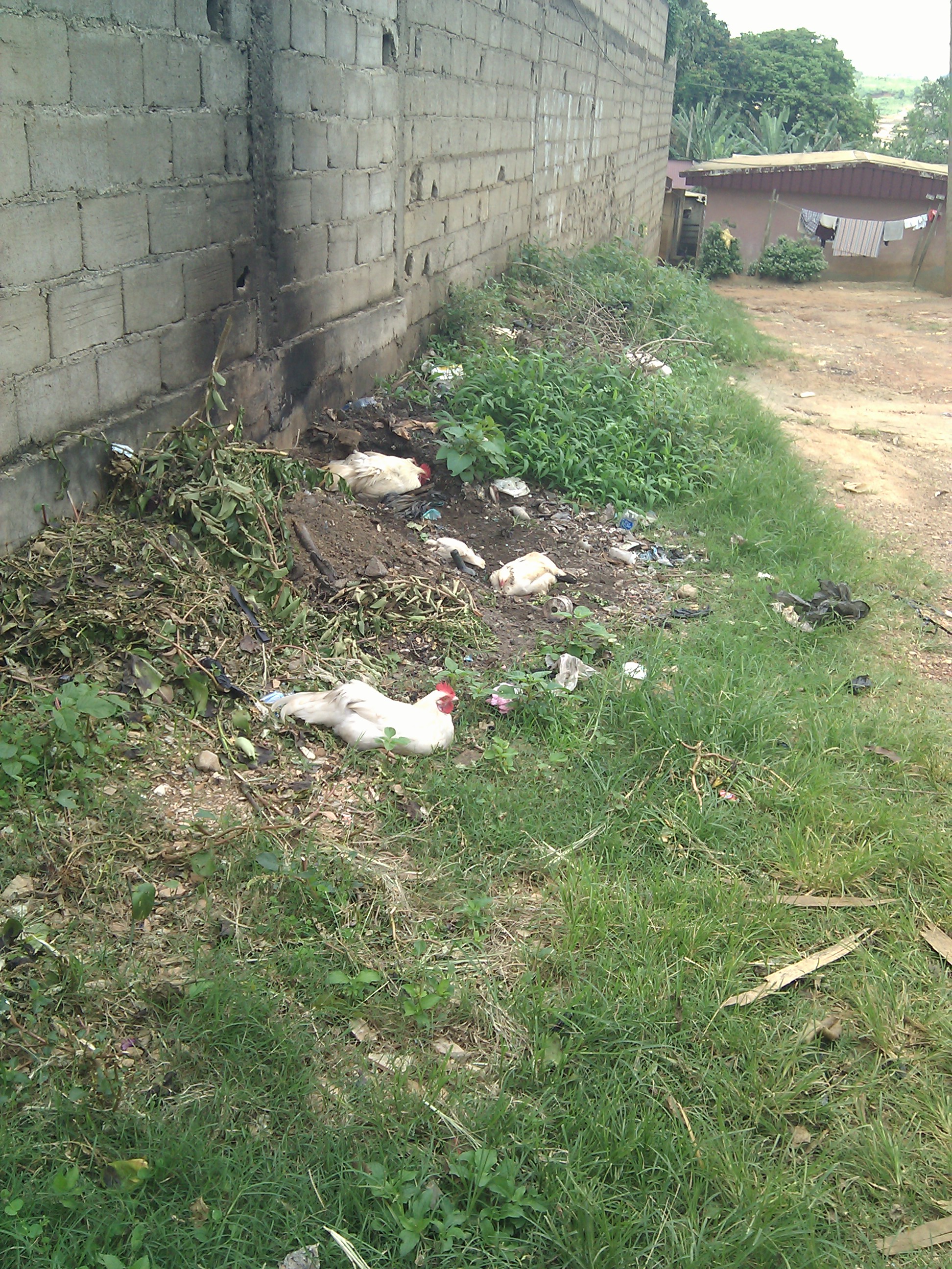 There are roaming chickens pretty much everywhere you go.  I’m (DeAnna) nervous when they seem to not be moving off to the side when I’m driving because I don’t want to hit it and have to pay the owner for the chicken I hit.  We didn’t know until living here that roosters crow all the time, not just in the morning, however, we are used to hearing them so they don’t keep us up anymore.  Just outside our gate is a poultry family who likes to nest in the ashes of our neighbors burn pile.  As David would say “They are fowl.”