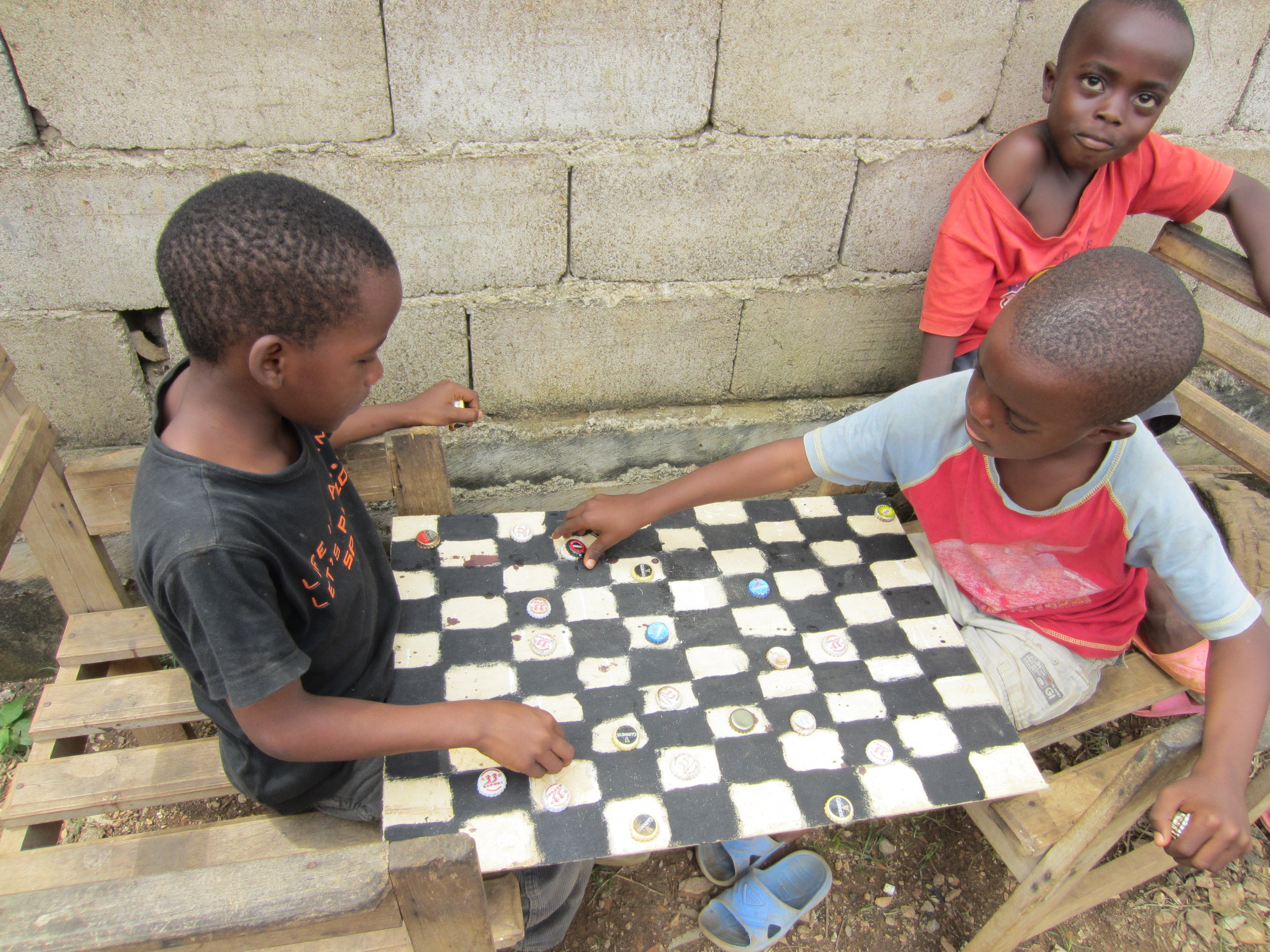 The other day I saw two little boys with a piece of pressed board that had a checked pattern painted on it.  They had this board resting on their legs as they faced one another.  The checkers were bottle caps they found on the ground throughout the neighborhood.