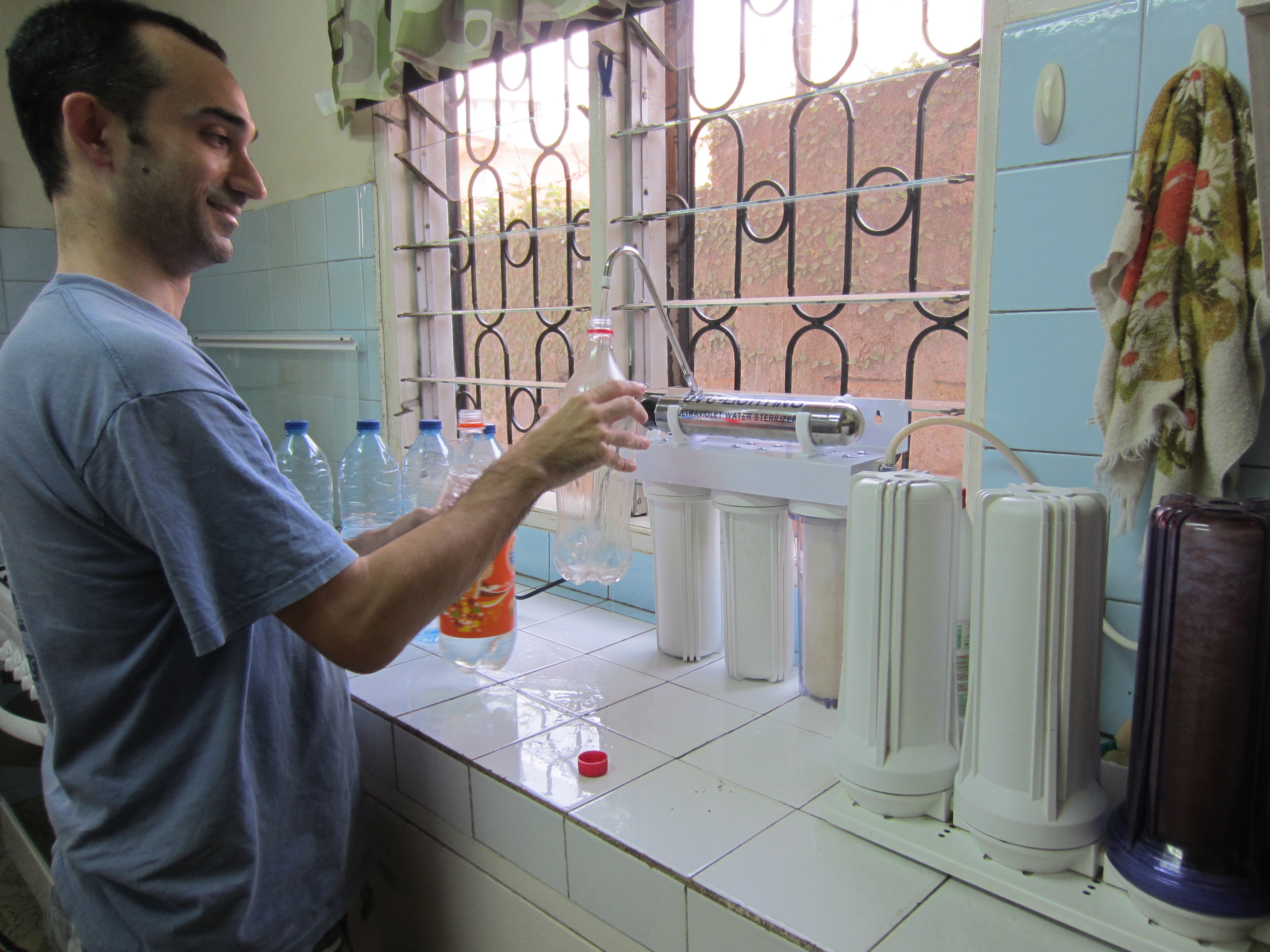 We purchased a new water filter, one that has a UV light that’s suppose to kill all the viruses and bacteria in the water.  This is our fifth water filter system since living in Cameroon and we hope it does the trick and we’ll stop having the repeated intestinal troubles.  Since our water gets turned off regularly, we keep a good supply of filtered water on hand.  We used the water in those bottles to water our plants outside and refilled them all with the new filter system’s filtered water.