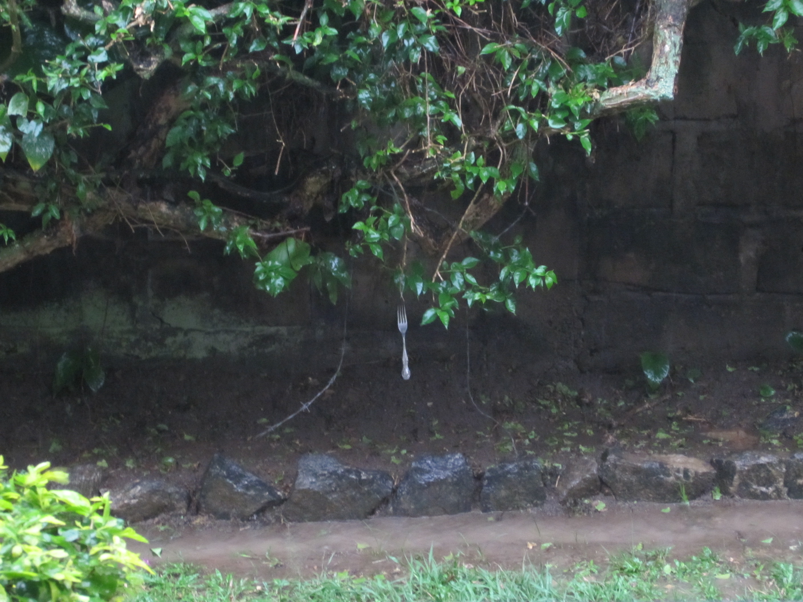 So I think we can say, it’s raining forks! It’s not our fork so either a neighborhood kid threw it into the bushes or the previous residents lost it in the bushes. I went looking for the keys, but they didn’t come down with the rain. Maybe next time, it’ll rain keys.