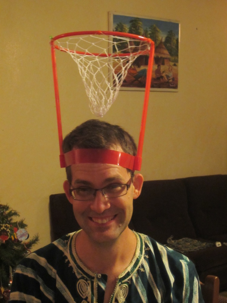 We were blessed on December 5th when the shipment arrived. We had items on that shipment that were ordered in March. There were two big boxes from loved ones in the States full of tastes of home and things just for fun. One of the just for items was a game called basket head. Jonah was the first to give it go. It’s a Velcro closing headband with an attached basket. There are 20 ping pong type balls that you throw into the air and try to catch in your basket. Now, when we have someone over we have them also try this fun game.