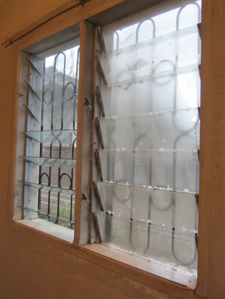 I get on cleaning kicks every so often, when I’ll remove light fixtures to clean them, wash curtains, etc… I had the idea this morning that I should wash the curtains because it’s been a while. As I was removing the curtains I found a neglected set of windows. These windows were skipped over last week in the window cleaning process and wowsa on the dirt factor! Since we’re in dry season, our windows get cleaned twice a week and need it at least twice a week, if not more. This particular set of windows aren’t seen often because they are in the back room and we have things on the floor in front of the windows, so no easy access. Well, they had to be cleaned. The below picture shows the windows on the left have had their initial cleaning and the windows on the right have only had vinegar squirted on them to beginning the cleaning process.