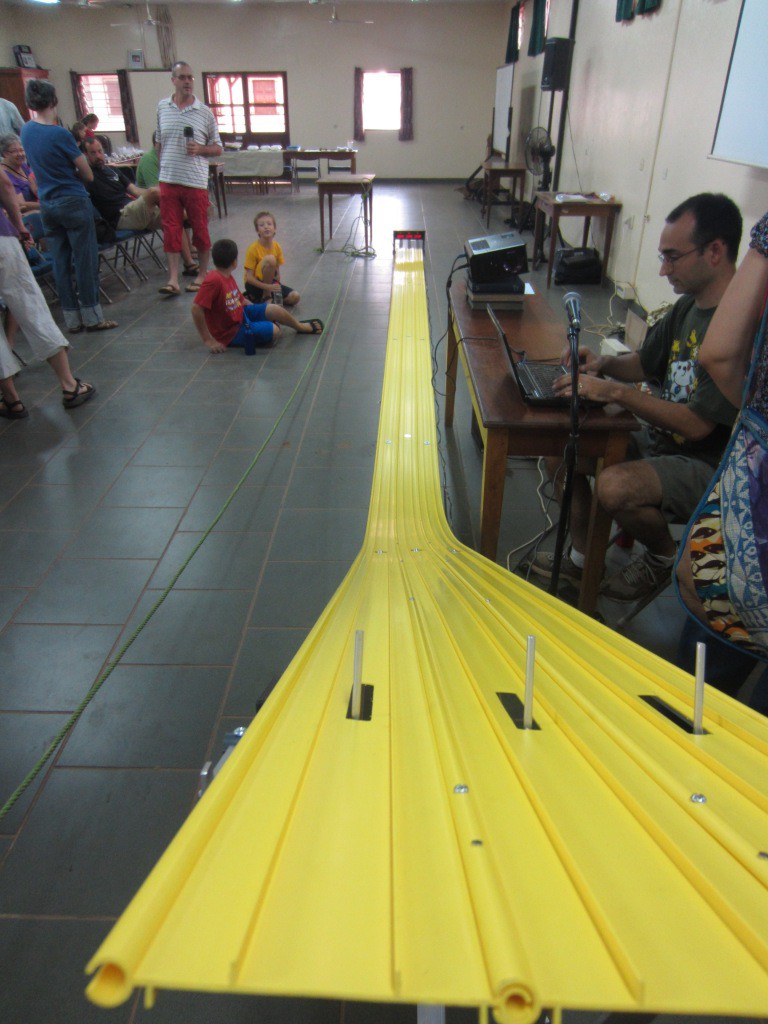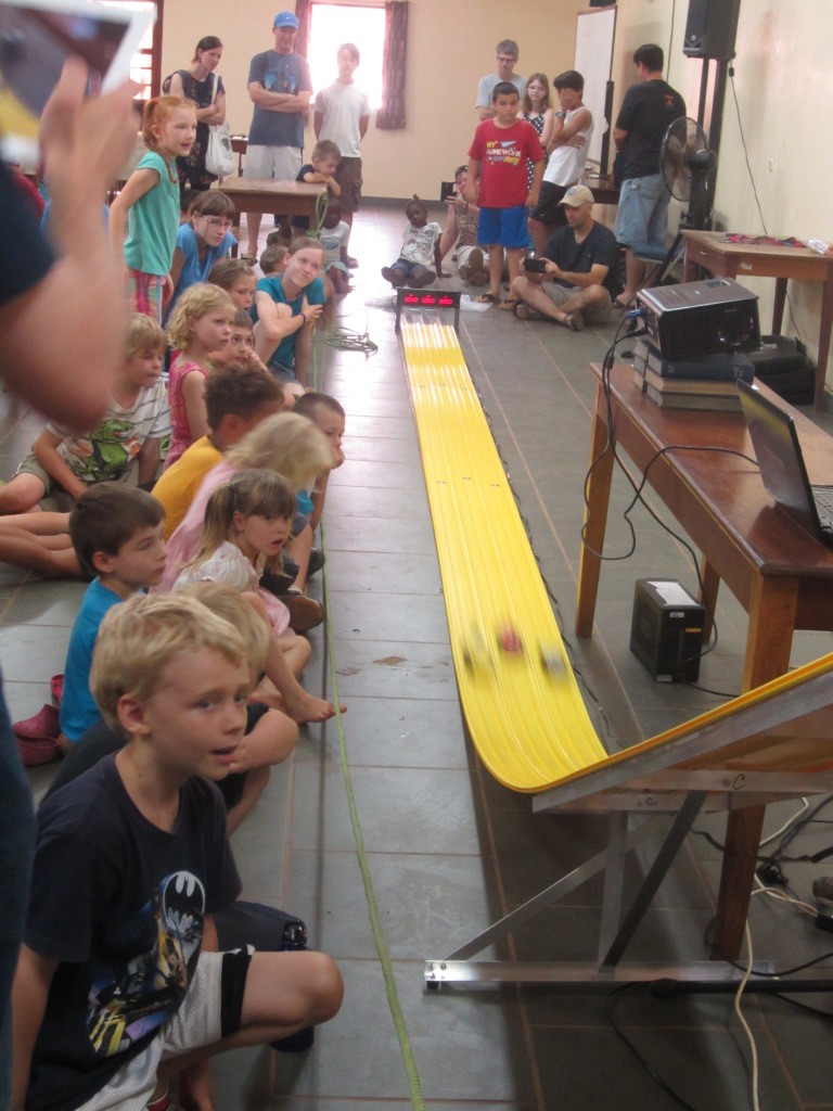 The annual CAM Car Race took place on April 18th. This was our fifth year in a row to coordinate the fun event. It’s a pinewood derby race. We plan for the event a year in advance by ordering the car kits and paint. Last year the wooden track we had been using for many years warped some and just didn’t fare well over the years in storage, so it was decided we needed to order a new track. It’s quite a challenge to order a new track from continents away and needing to take into consideration no wood – because of warping, termites and wood mites, no regular metal because of high humidity it quickly rusts, etc… It was decided to order a track that was made of PVC and had sensors to give the times and places during each heat.